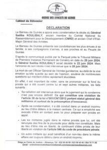Le Barreau de Guinée présente ses condoléances les plus émues à sa famille, à ses compagnons d’armes, à ses proches et au Peuple de Guinée.