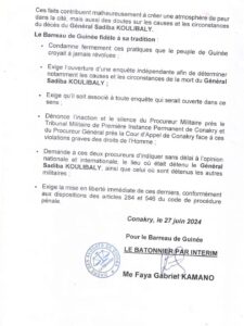 D’après le communiqué publié par le Parquet près le Tribunal Militaire de Première Instance Permanent de Conakry en date du 25 juin 2024, le Général Sadiba KOULIBALY serait décédé le 22 juin 2024. Mais l’annonce de son décés n’est intervenue que le 25 juin 2024.