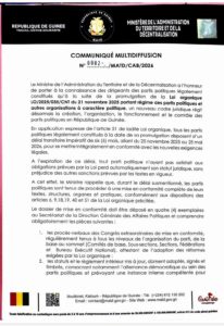 Dans un communiqué de multidiffusion daté du 25 février 2026, le ministère informe les dirigeants des partis légalement constitués qu’à la suite de la promulgation de la Loi organique L/2025/035/CNT du 21 novembre 2025, un nouveau cadre juridique régit désormais la création, l’organisation, le fonctionnement et le contrôle des partis politiques en Guinée. Un délai de six mois accordé Conformément à l’article 51 de la loi, les partis politiques disposent d’un délai transitoire impératif de six (6) mois, allant du 25 novembre 2025 au 25 mai 2026, pour se conformer pleinement aux nouvelles dispositions légales. Passé ce délai, tout parti politique qui n’aura pas rempli les obligations prévues perdra automatiquement son statut juridique, sans préjudice des autres sanctions prévues par la législation en vigueur. Des exigences claires et obligatoires Durant cette période, les partis sont tenus de procéder à une mise en conformité complète de leurs textes, structures, organes de direction et pratiques internes. Le dossier de conformité doit être déposé en quatre exemplaires à la Direction Générale des Affaires Politiques. Parmi les pièces exigées figurent notamment :